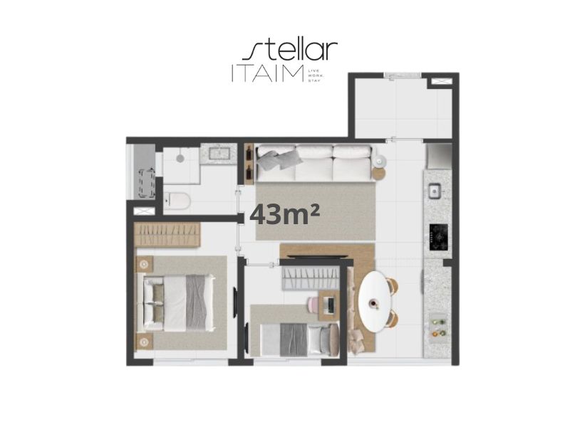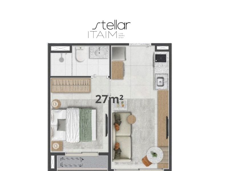 • Plantas inteligentes de 25m², 27m², 32m² e 43m², projetadas para otimizar conforto e funcionalidade.